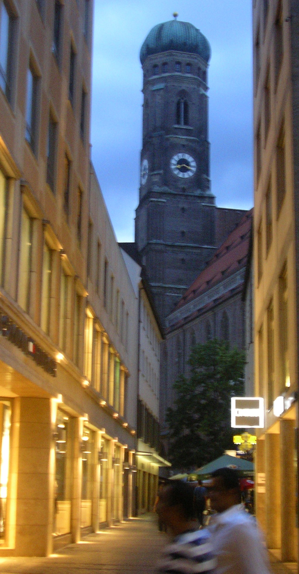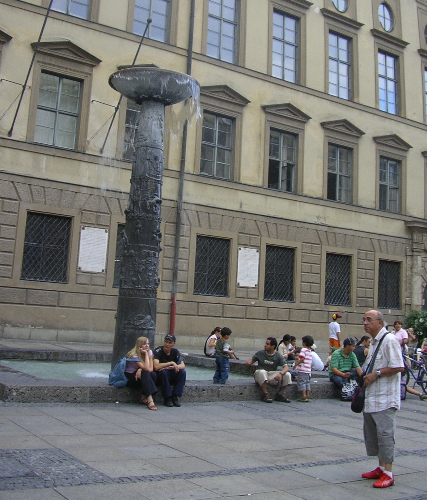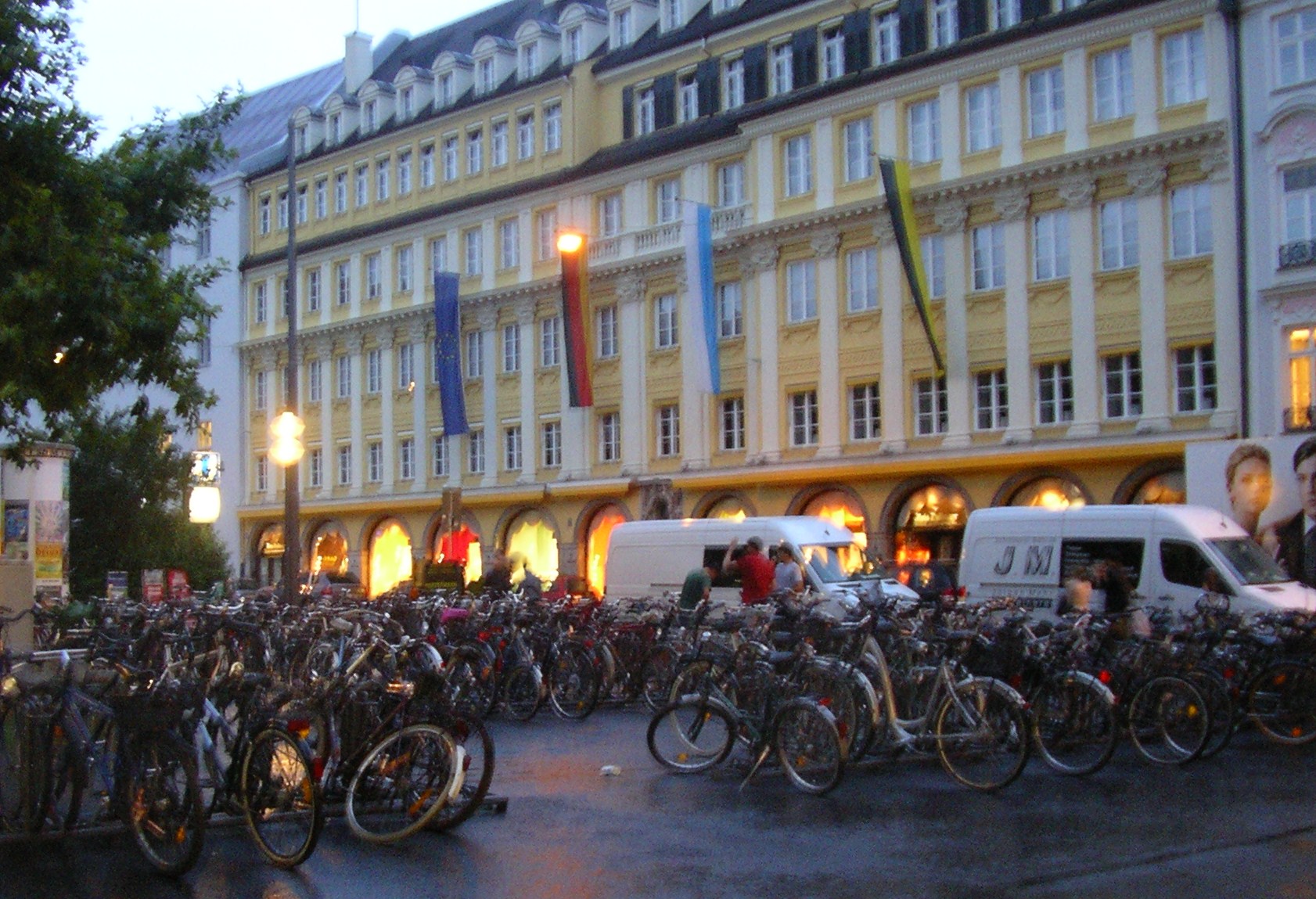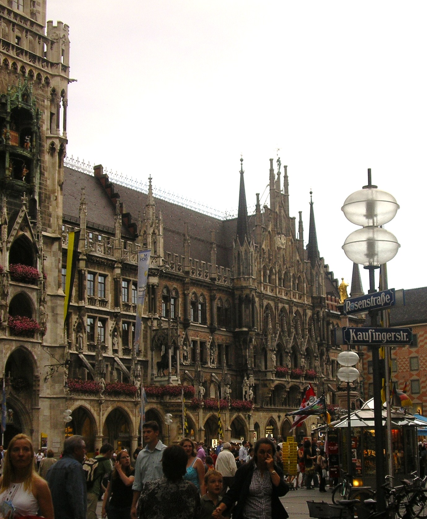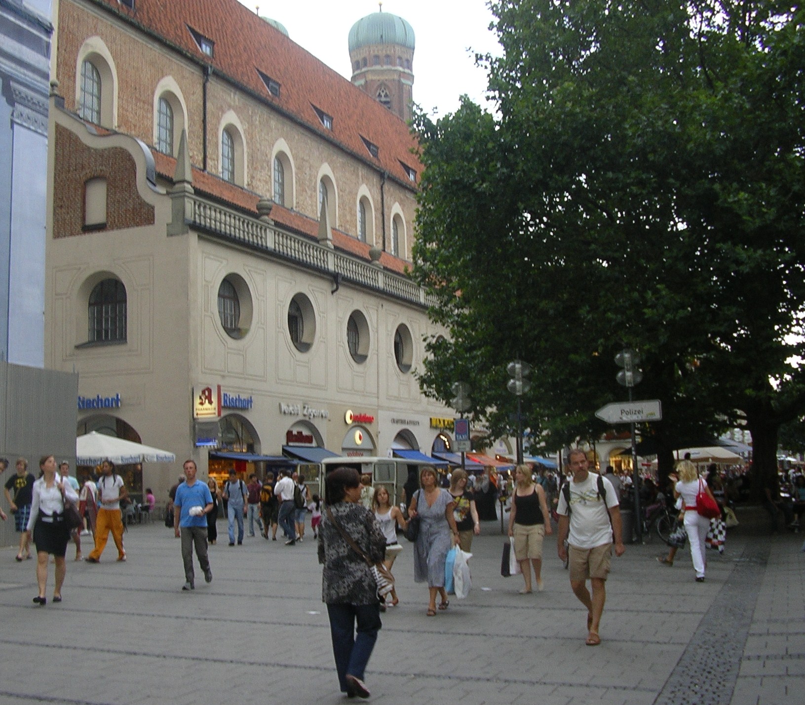 Els carrers del centre estaven plens de vianants que pasejaven tranquil·lament o prenien alguna cosa en una de les moltes terrasses que hi ha. Llàstima que al cap d’una estona es va posar a ploure i vam tenir que marxar sobtadament cap a l’autocaravana. Vam tornar en taxi ja que ens va venir al cap que havíem deixat la claraboia oberta i amb la que queia segur que entraria l’aigua a gots i barrals. El taxista ens va fer de «cicerone». Entre altres façanes d’edificis famosos ens va assenyalar la de la «casa marron» inaugurada per Hitler el 1930. De fet Munich va ser anomenada per Hitler «capital del moviment» del nacional-socialisme.