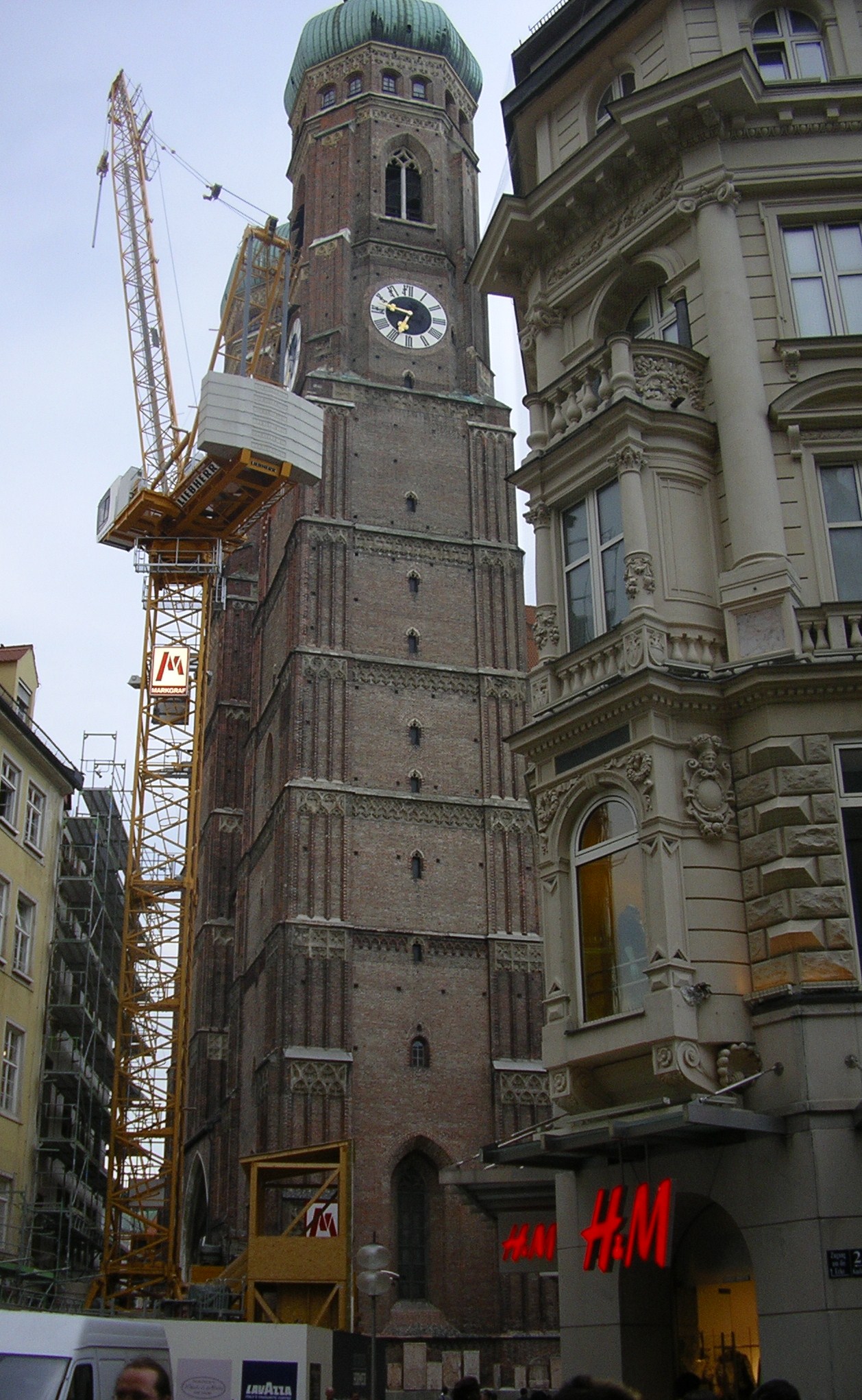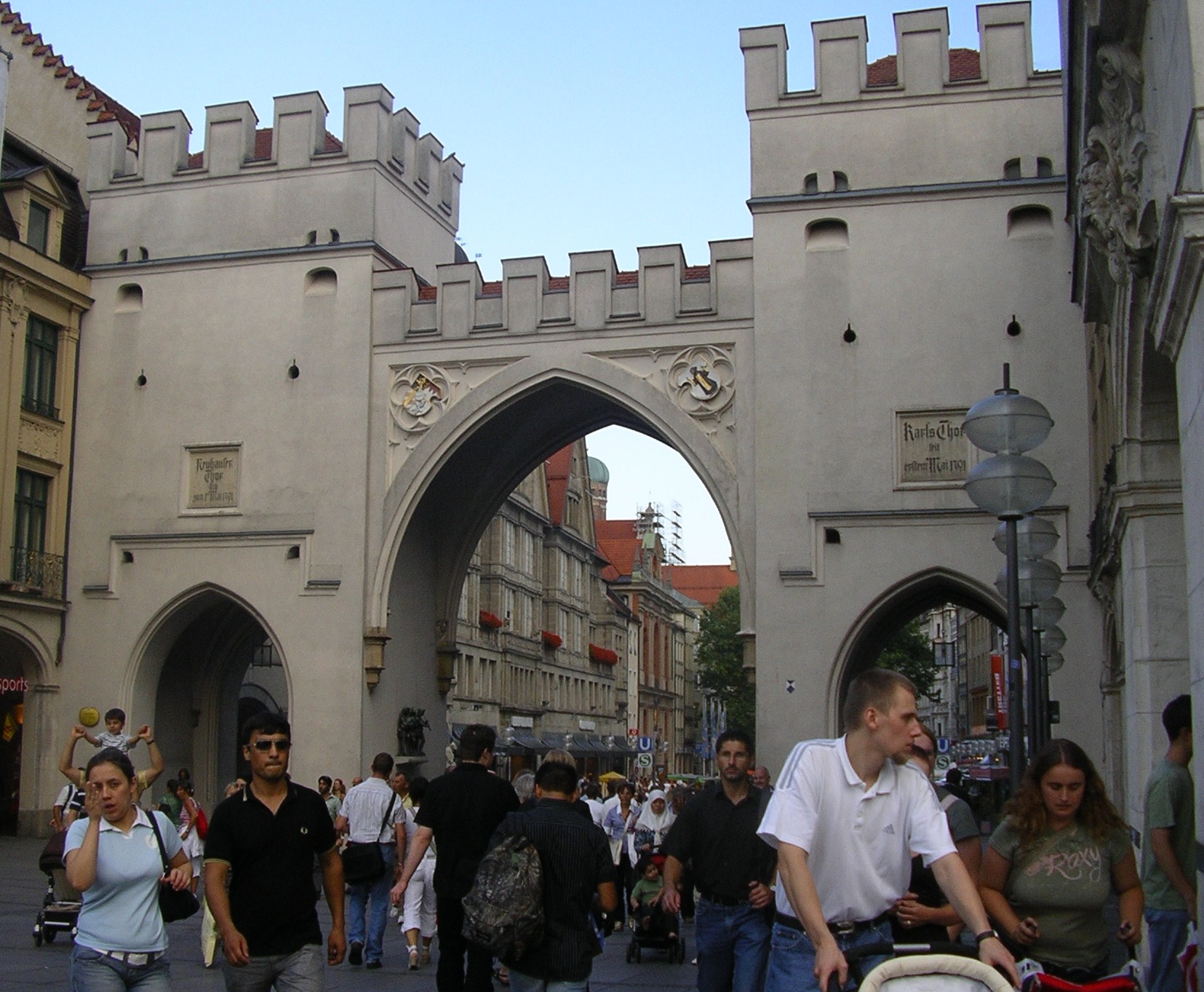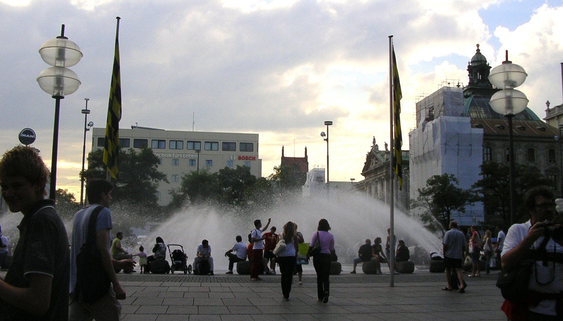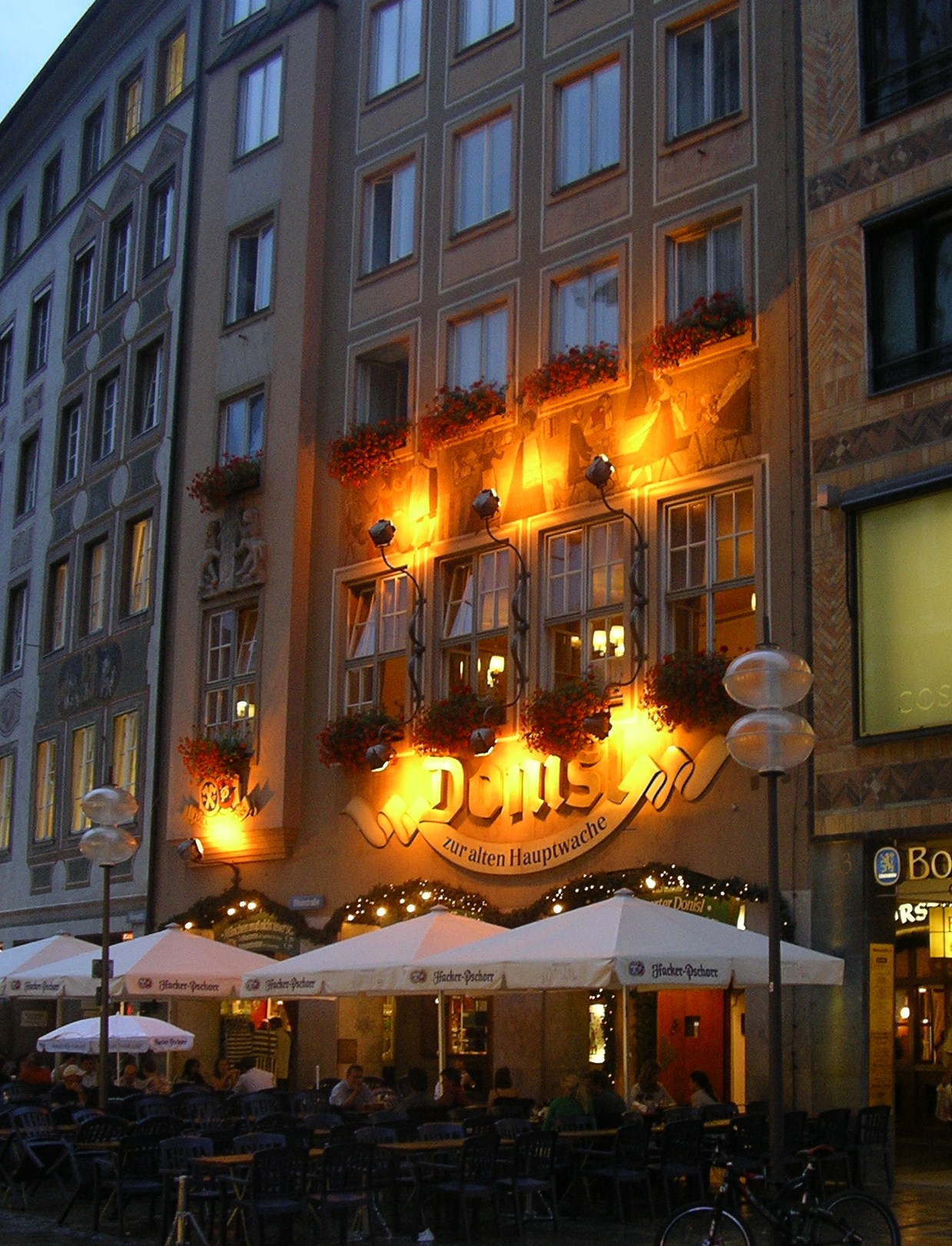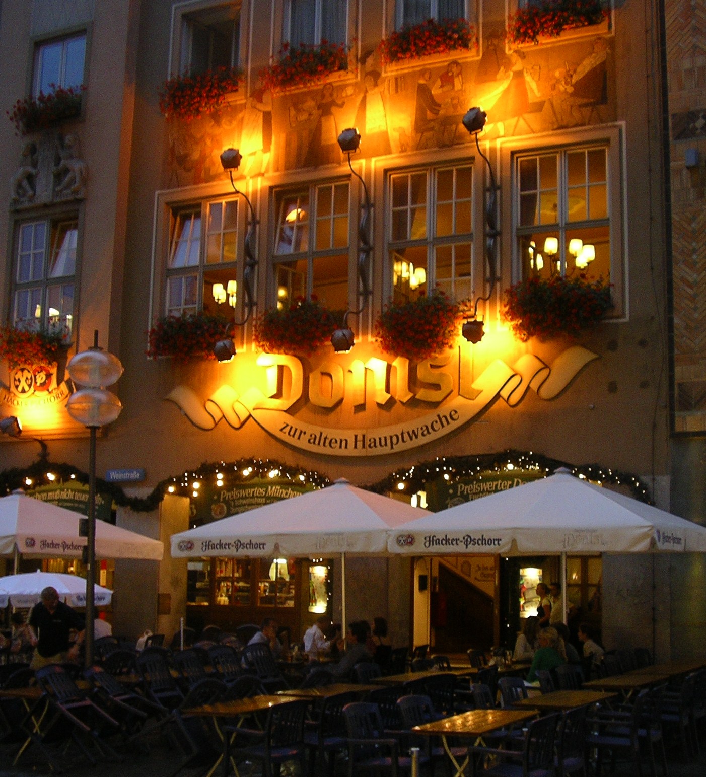 Els carrers del centre estaven plens de vianants que pasejaven tranquil·lament o prenien alguna cosa en una de les moltes terrasses que hi ha. Llàstima que al cap d’una estona es va posar a ploure i vam tenir que marxar sobtadament cap a l’autocaravana. Vam tornar en taxi ja que ens va venir al cap que havíem deixat la claraboia oberta i amb la que queia segur que entraria l’aigua a gots i barrals. El taxista ens va fer de «cicerone». Entre altres façanes d’edificis famosos ens va assenyalar la de la «casa marron» inaugurada per Hitler el 1930. De fet Munich va ser anomenada per Hitler «capital del moviment» del nacional-socialisme.