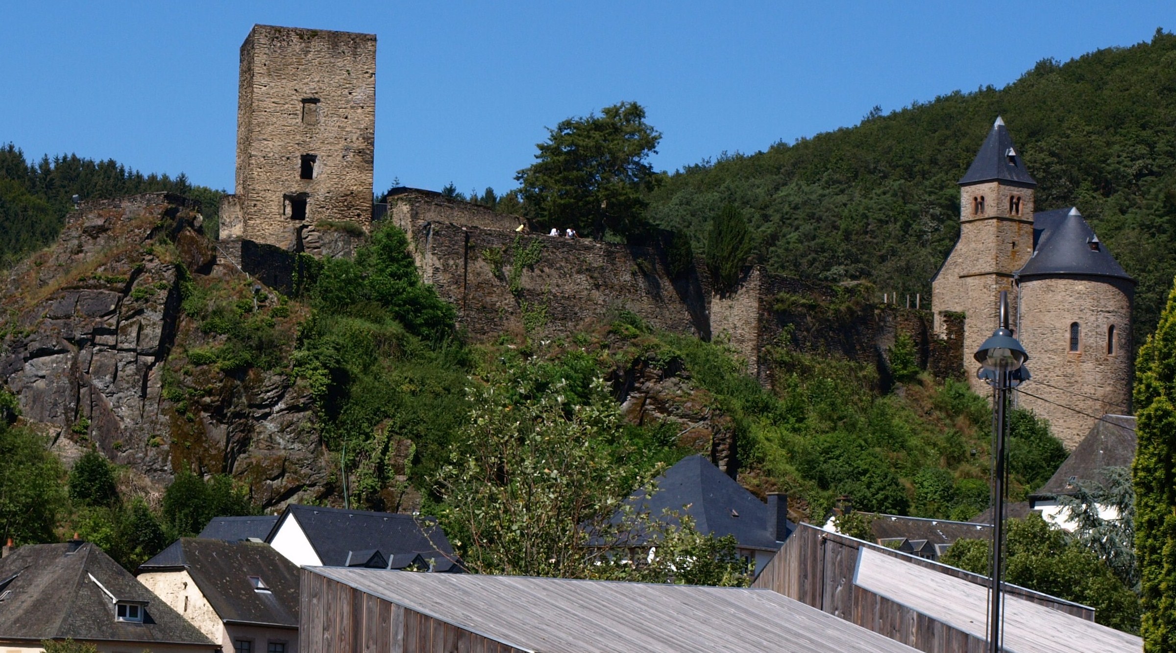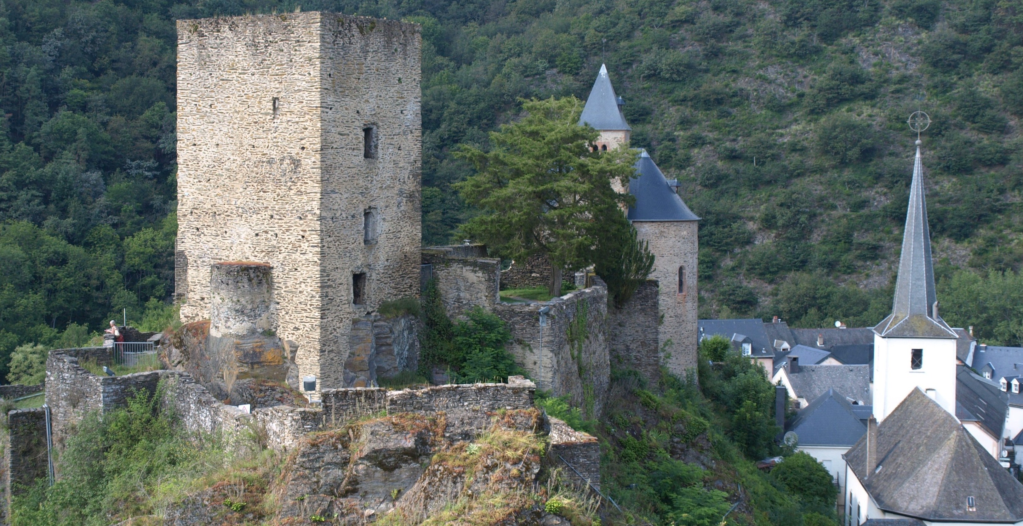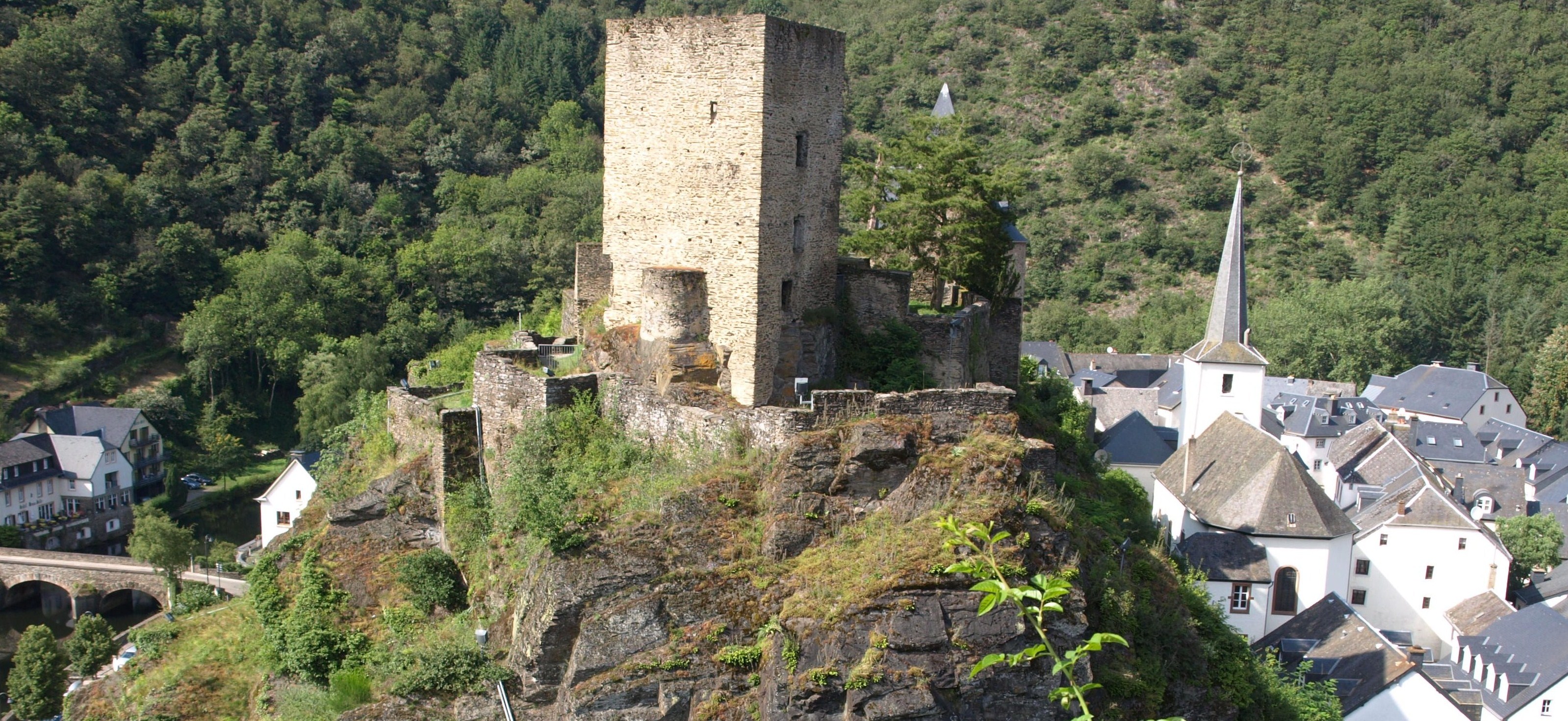 Vistes panoràmiques d’Esch-sur-Sûre des de l’esperò montanyós coronat pel Torreó