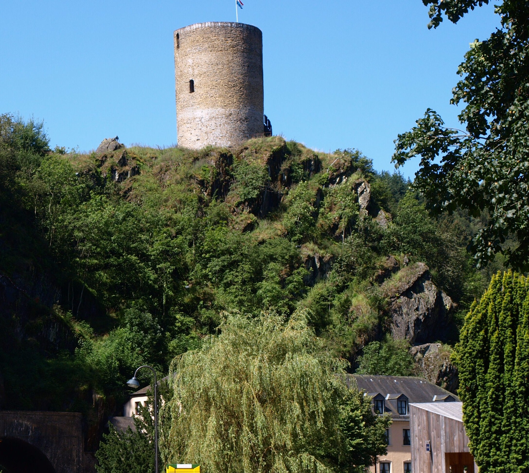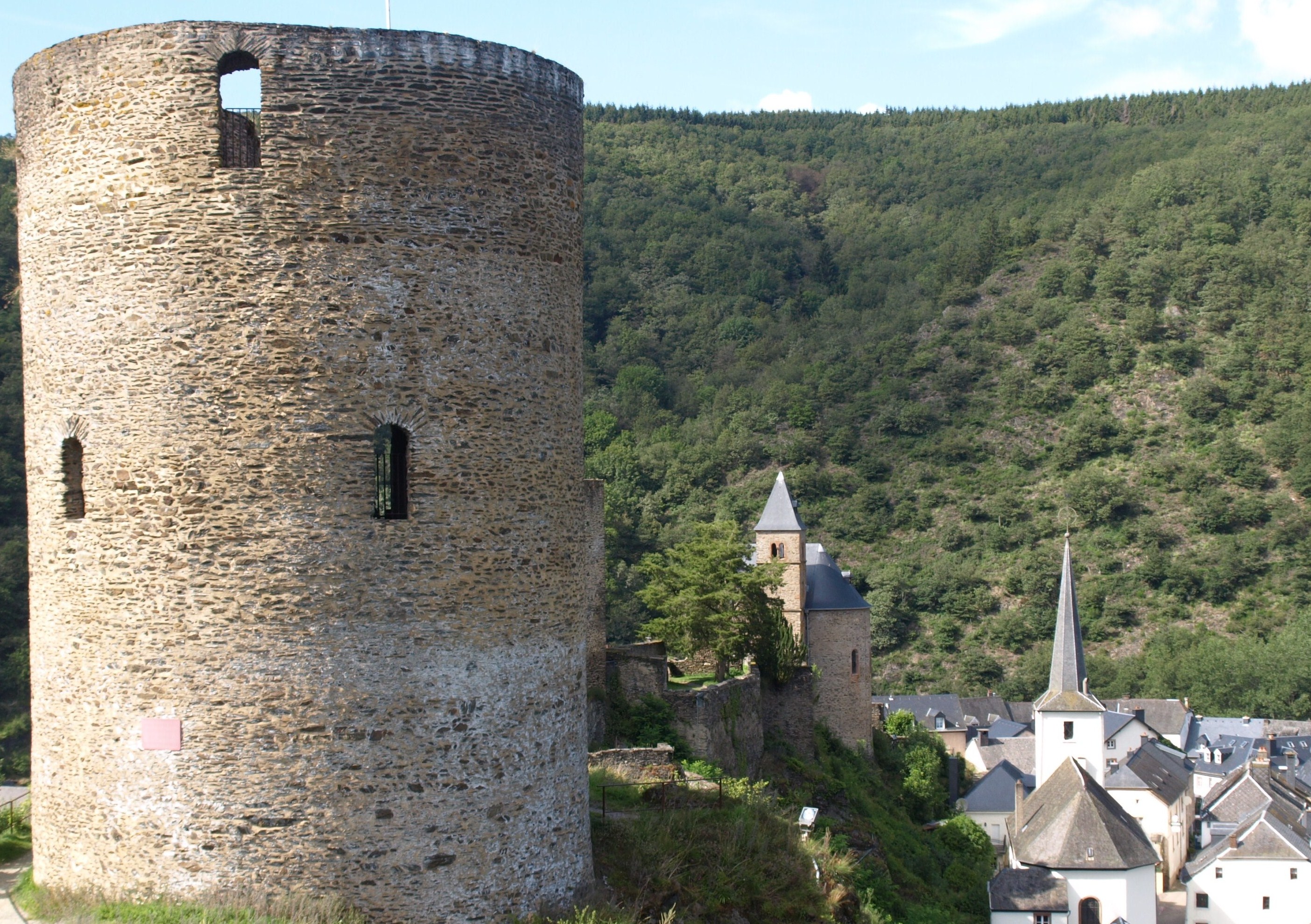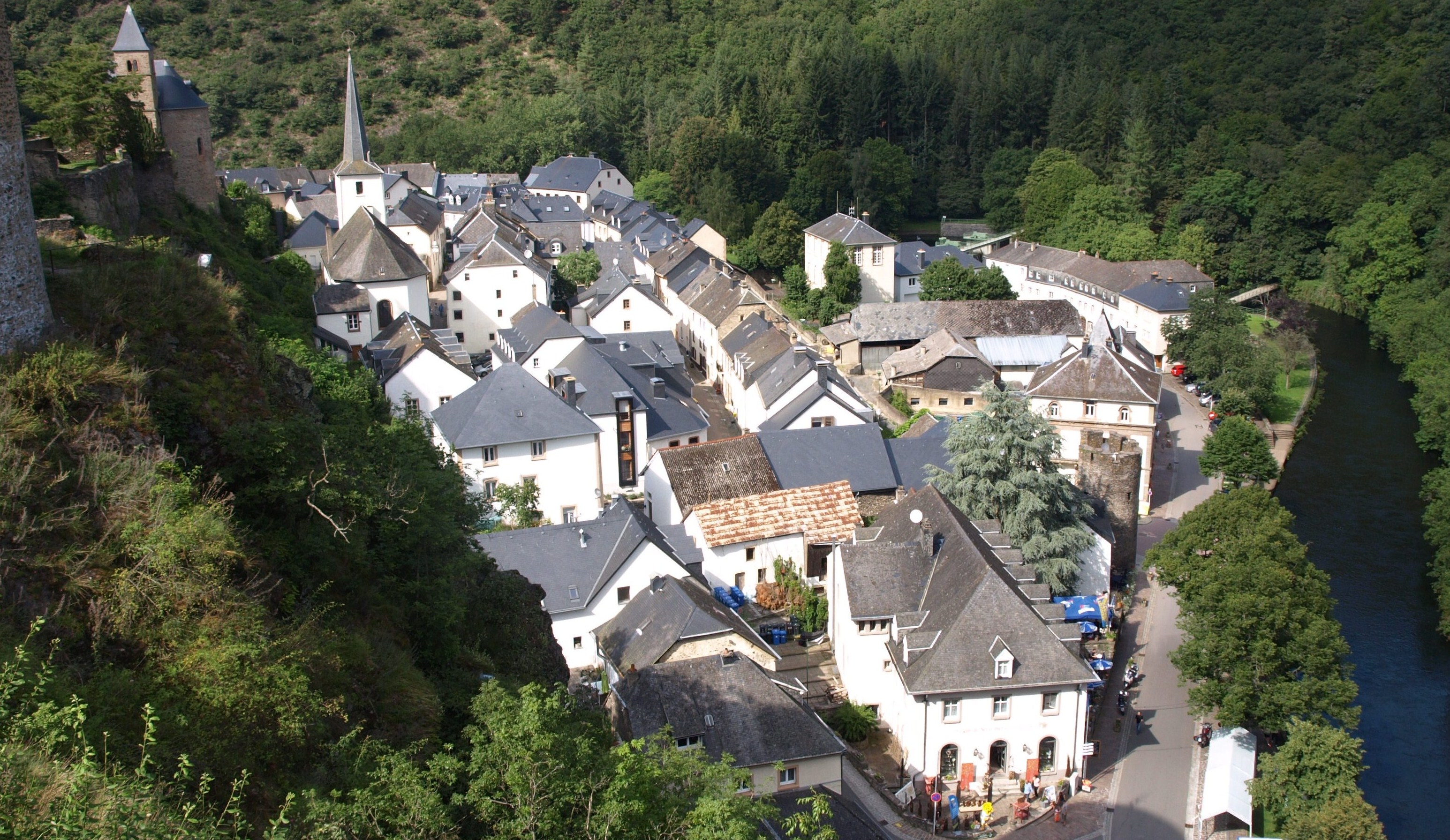 Vistes panoràmiques d’Esch-sur-Sûre des de l’esperò montanyós coronat pel Torreó