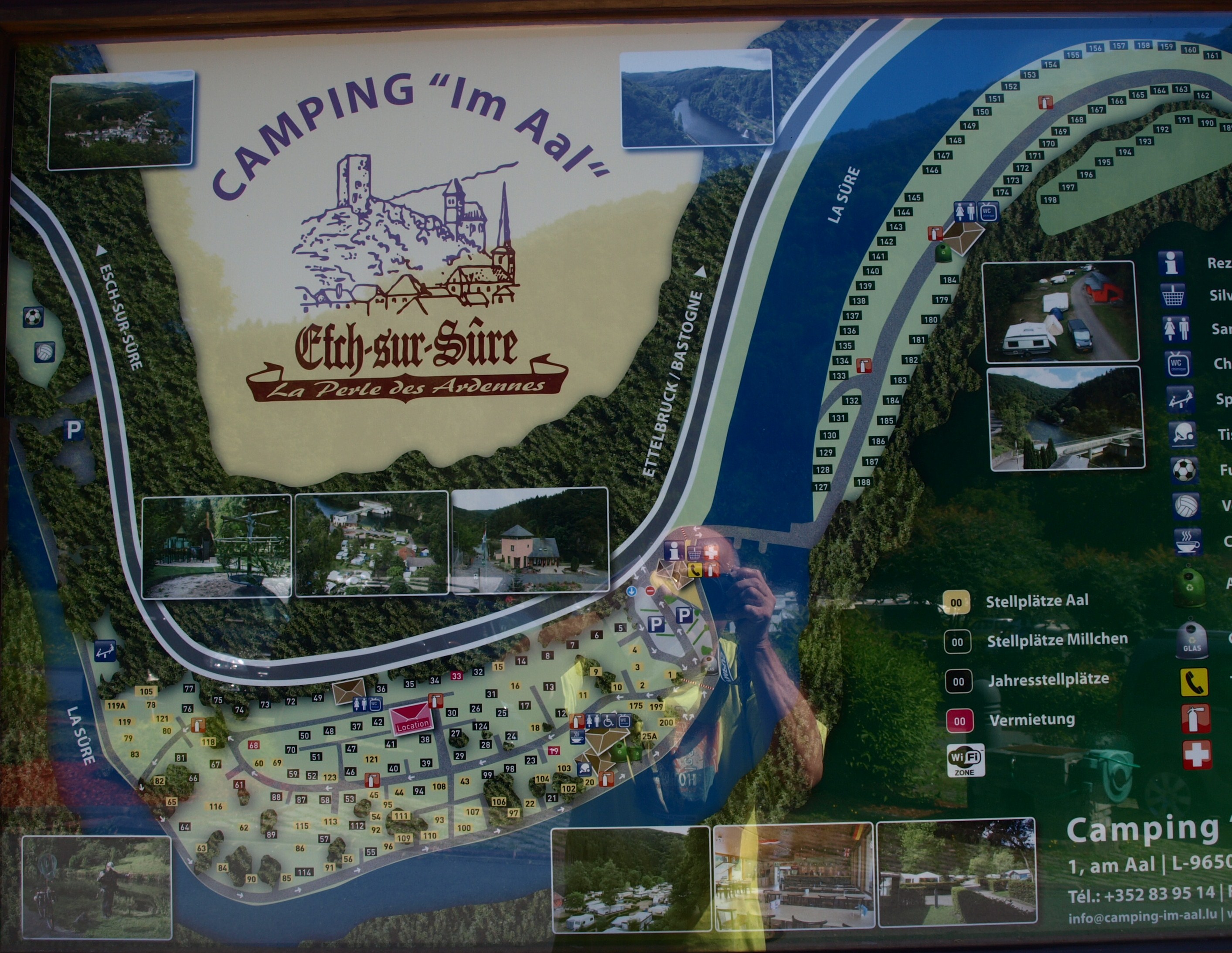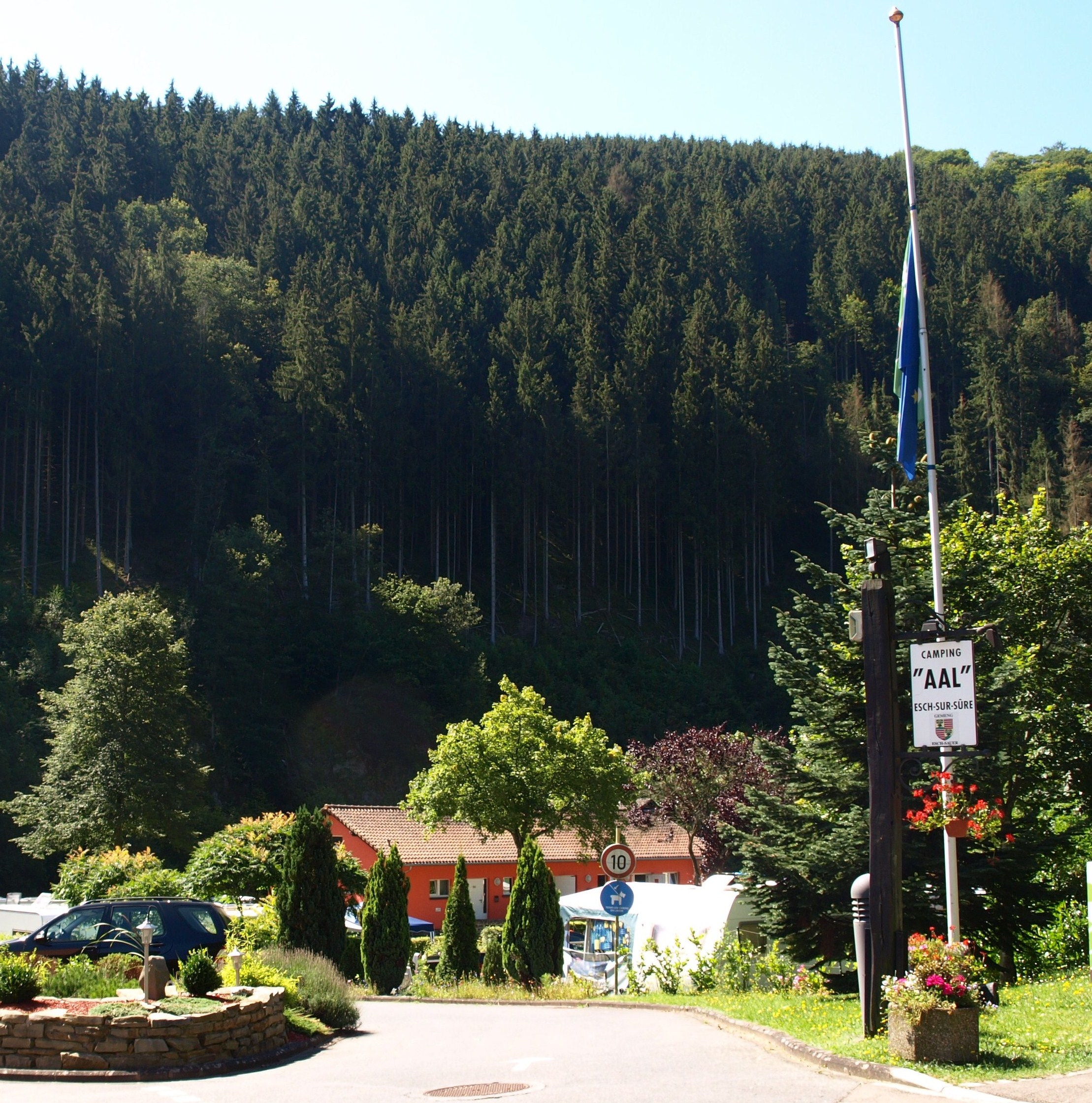 Des de Luxemburg vam enfilar cap a les Ardenes luxemburgueses i el primer lloc on ens vam aturar va ser en un bonic càmping rodejat de muntanyes i al costat mateix del Sure i a uns 300 metres d’Esch. El nom del càmping és Im Aal i va ser un dels llocs on ens vam trobar més a gust de tot Luxemburg i on vam poder comprobar que el matrimoni que gestiona el càmping són unes bellísimes persones, atents i amables amb els seus clients i servicials si et trobes amb algun problema. Sincerament us recomano que, si en algun moment trepitjeu terres luxemburgueses, no dubteu en visitar aquesta magnífica vall del Sure i us instal·leu en aquest càmping, ja que per moltes raons, val realment la pena.