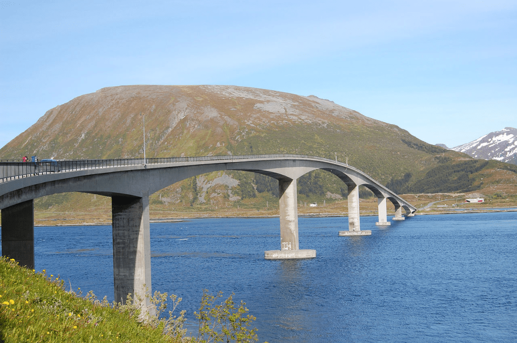 Seguim la ruta en direcció al pont de Gimsoystraumen. Parem abans de travessar el pont per dinar en una gran esplanada on també hi ha altres AC aturades i des d’on podem gaudir d’unes boniques vistes d’aquesta obra d’enginyeria.